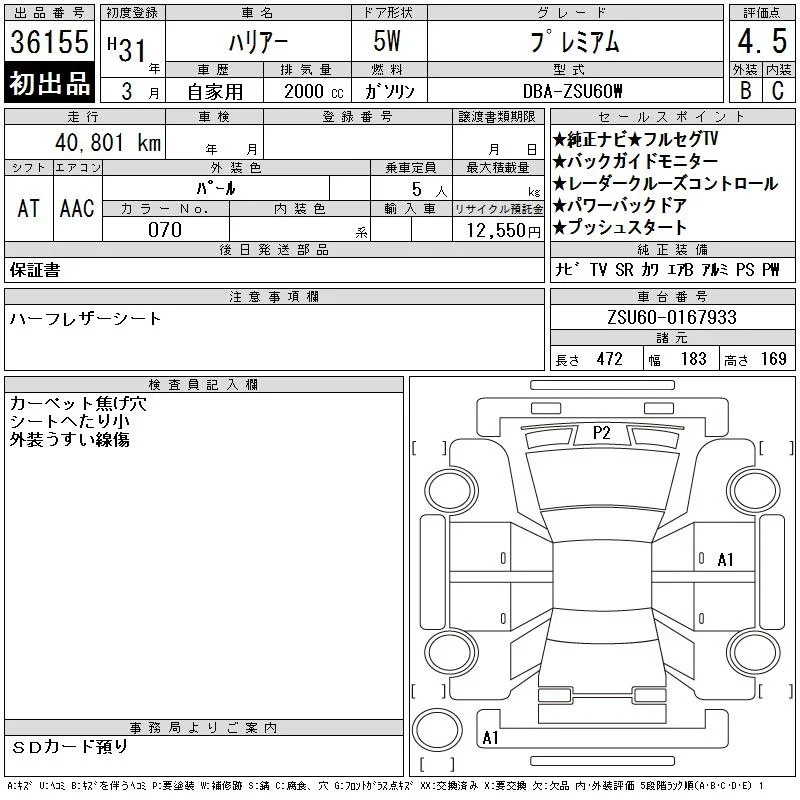 | Vehicle notes: Gスマートキー 260109 保 AA GRADE 4.5 / SUN ROOF / LED HEAD LIGHT / POWER BACK DOOR / HALF LEATHER SEAT / POWER SEAT / NAVI / BACK CAMERA / SMART KEY / PUSH START / STEERING SWITCH / CRUISE CONTROL |